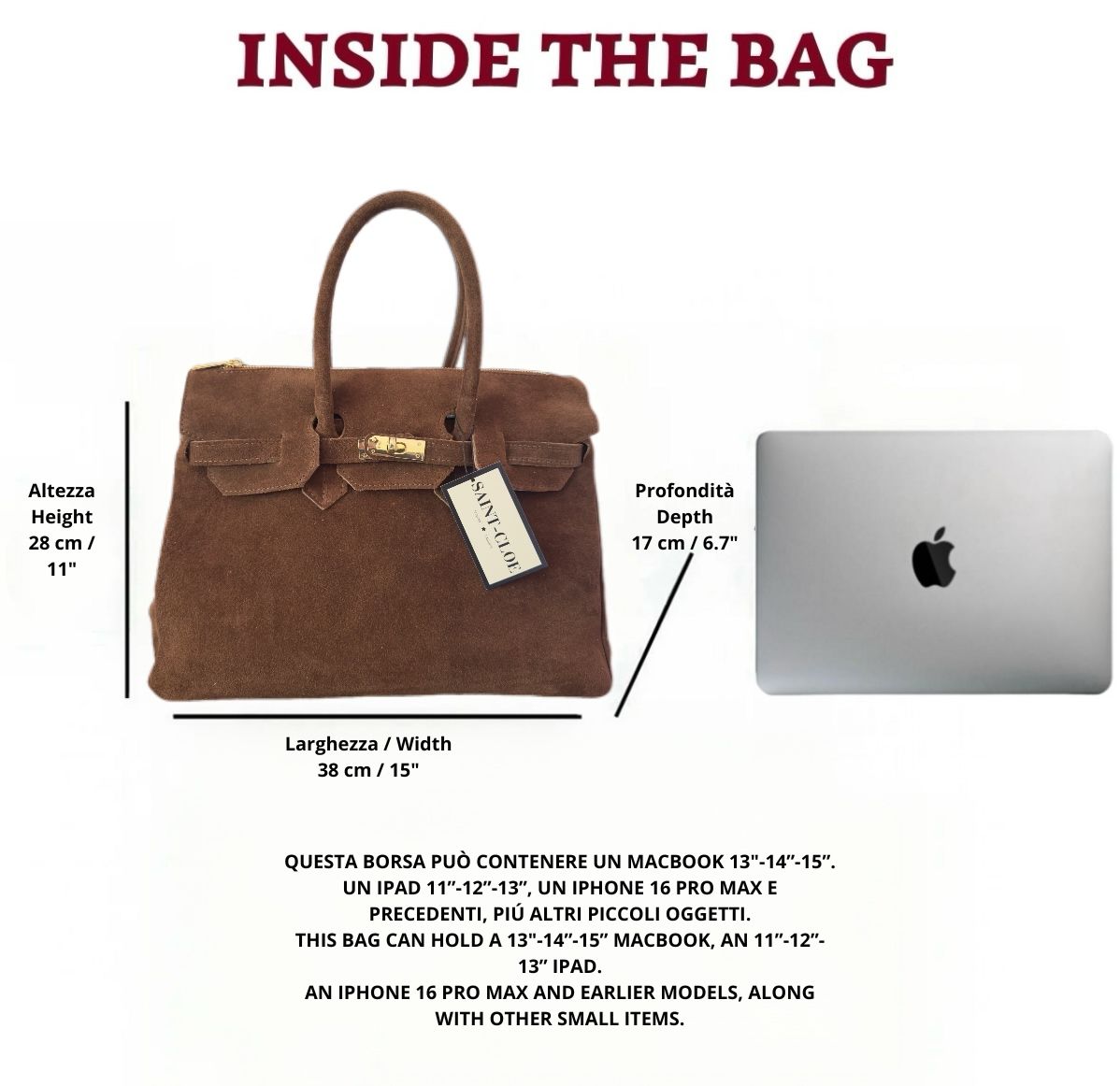 Confectionné en cuir Suède de haute qualité, avec un grain souple et une structure élégante, il représente l’équilibre parfait entre style et fonctionnalité. L’ouverture à rabat avec fermeture éclair assure praticité et sécurité, tandis que l’intérieur en coton avec poche zippée garde vos affaires bien rangées. Équipé de poignées et d’une bandoulière réglable pour s’adapter à toutes les occasions, du travail aux loisirs.