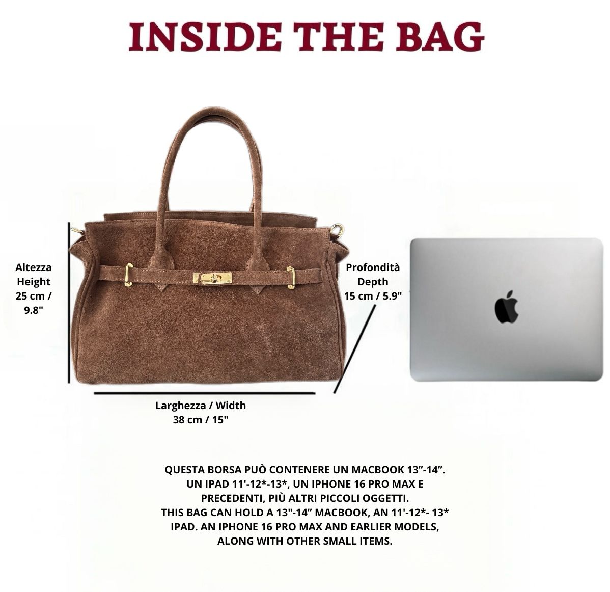 En cuir suédé de haute qualité, avec 3 compartiments et des détails dorés, le “Jolie” allie charme et fonctionnalité. Parfait pour le travail, les voyages et les journées intenses, toujours avec un style impeccable.
