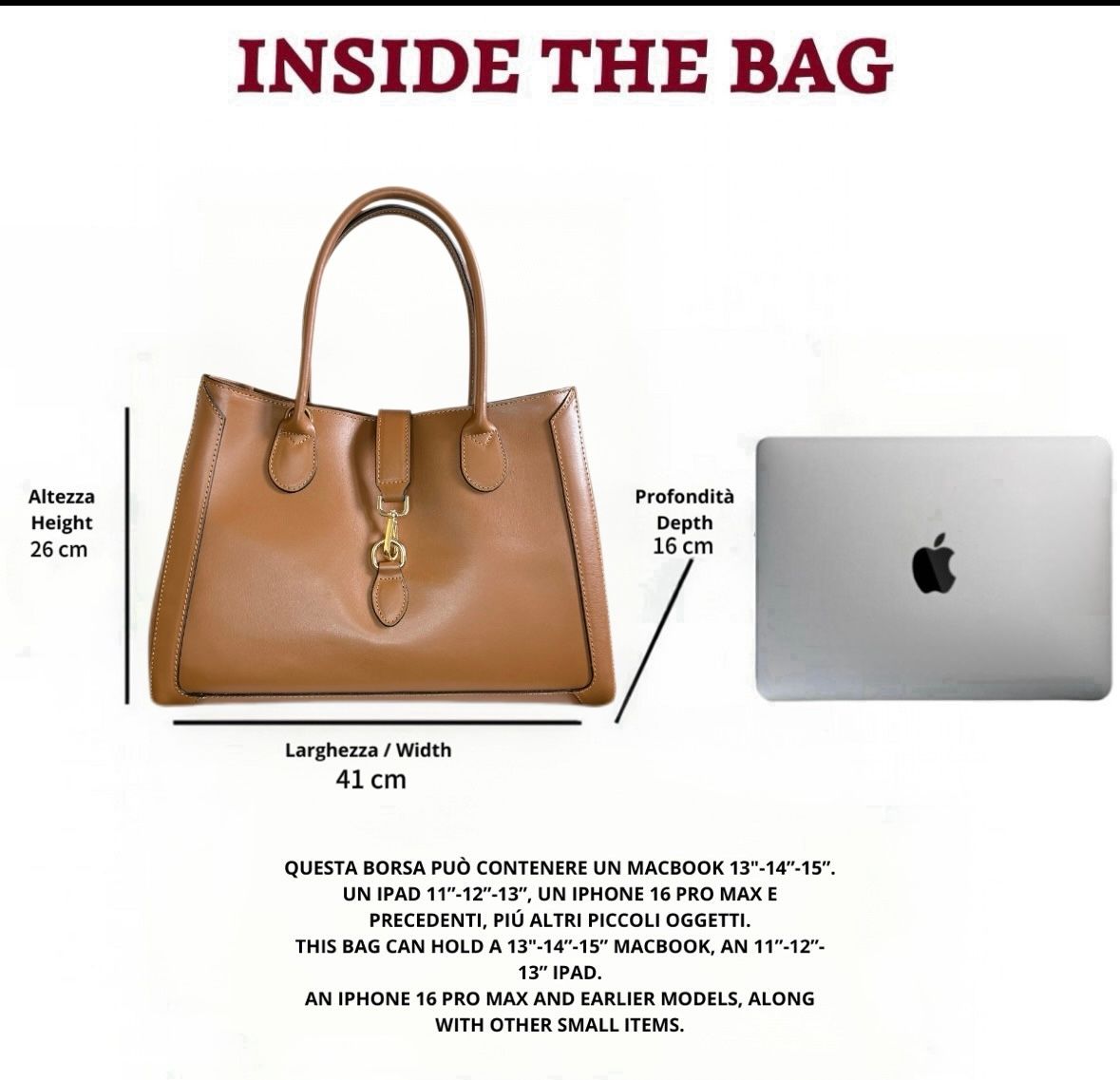 Portofino en cuir lisse couleur cuoio est conçue pour celles qui recherchent un sac spacieux et raffiné, parfait pour le travail et le quotidien.