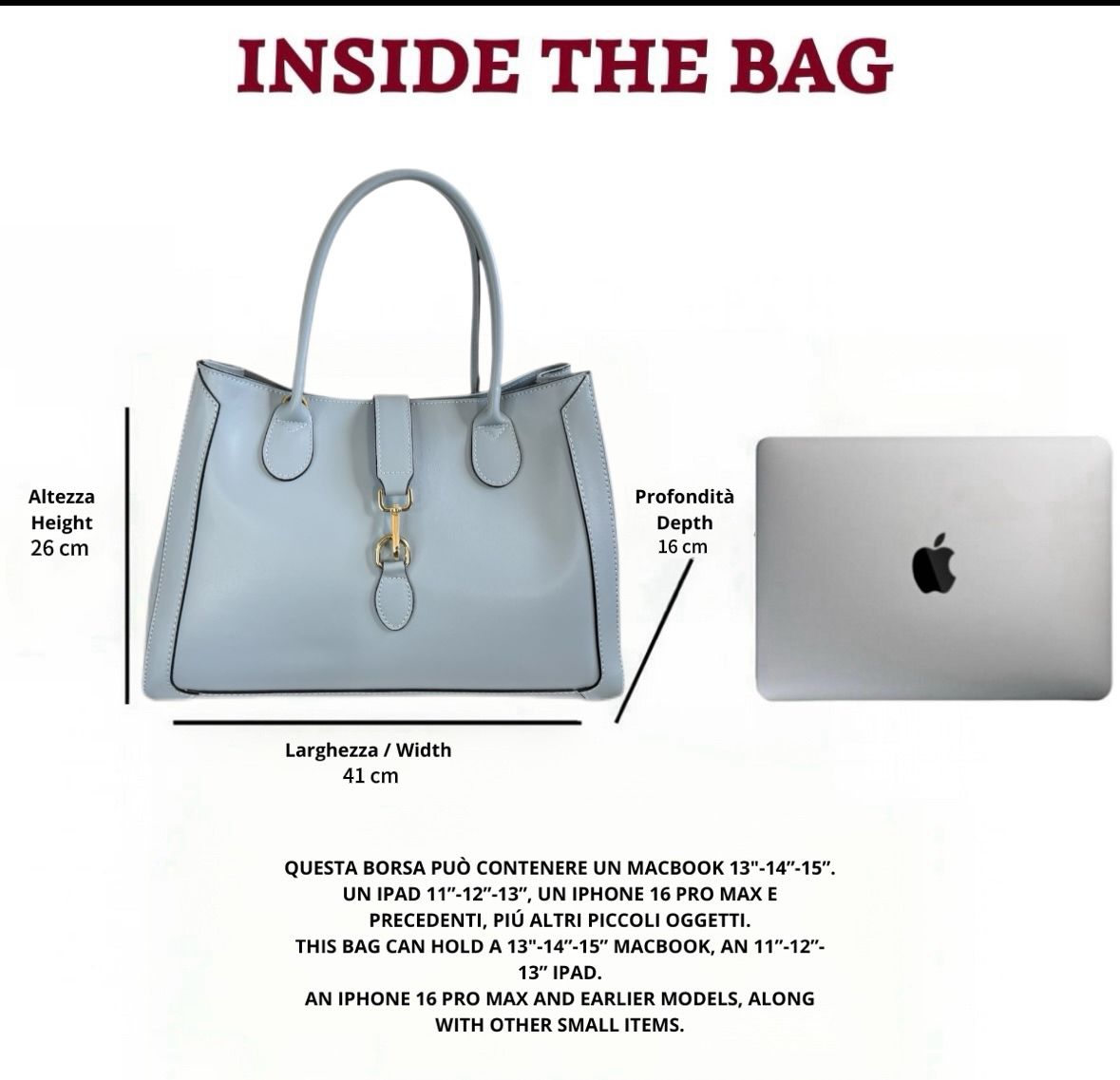 La teinte bleue apporte légèreté et raffinement, tandis que les détails dorés subliment le design épuré. L’intérieur, organisé en trois compartiments séparés, garantit ordre et praticité.