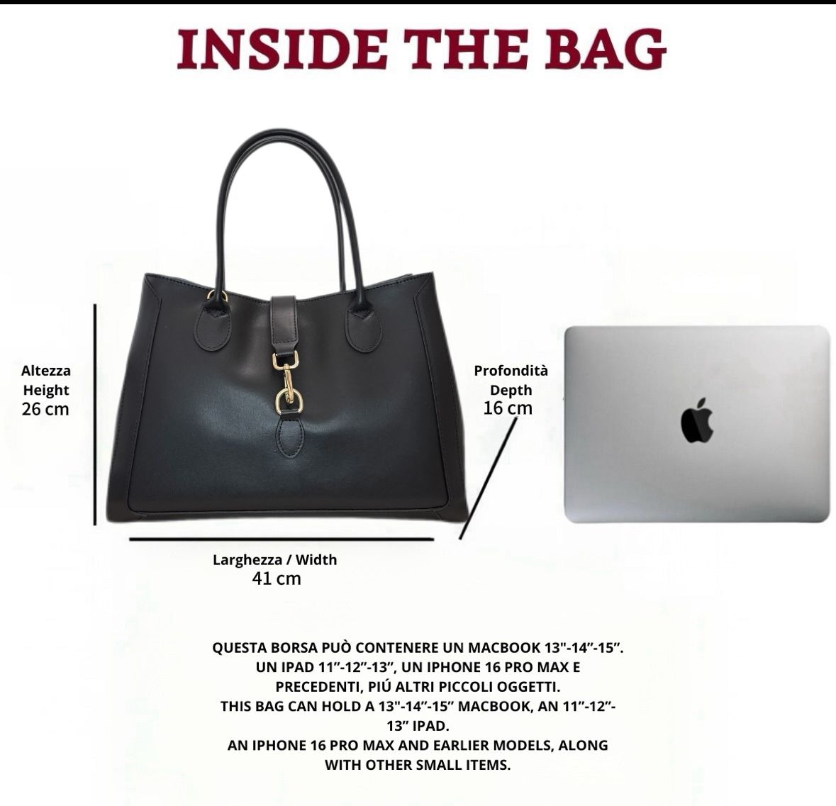 Le noir profond exprime une élégance absolue et une grande polyvalence, tandis que les détails dorés mettent en valeur le design essentiel avec une touche lumineuse. L’intérieur, organisé en trois compartiments, garantit ordre et praticité pour garder facilement tous vos essentiels.