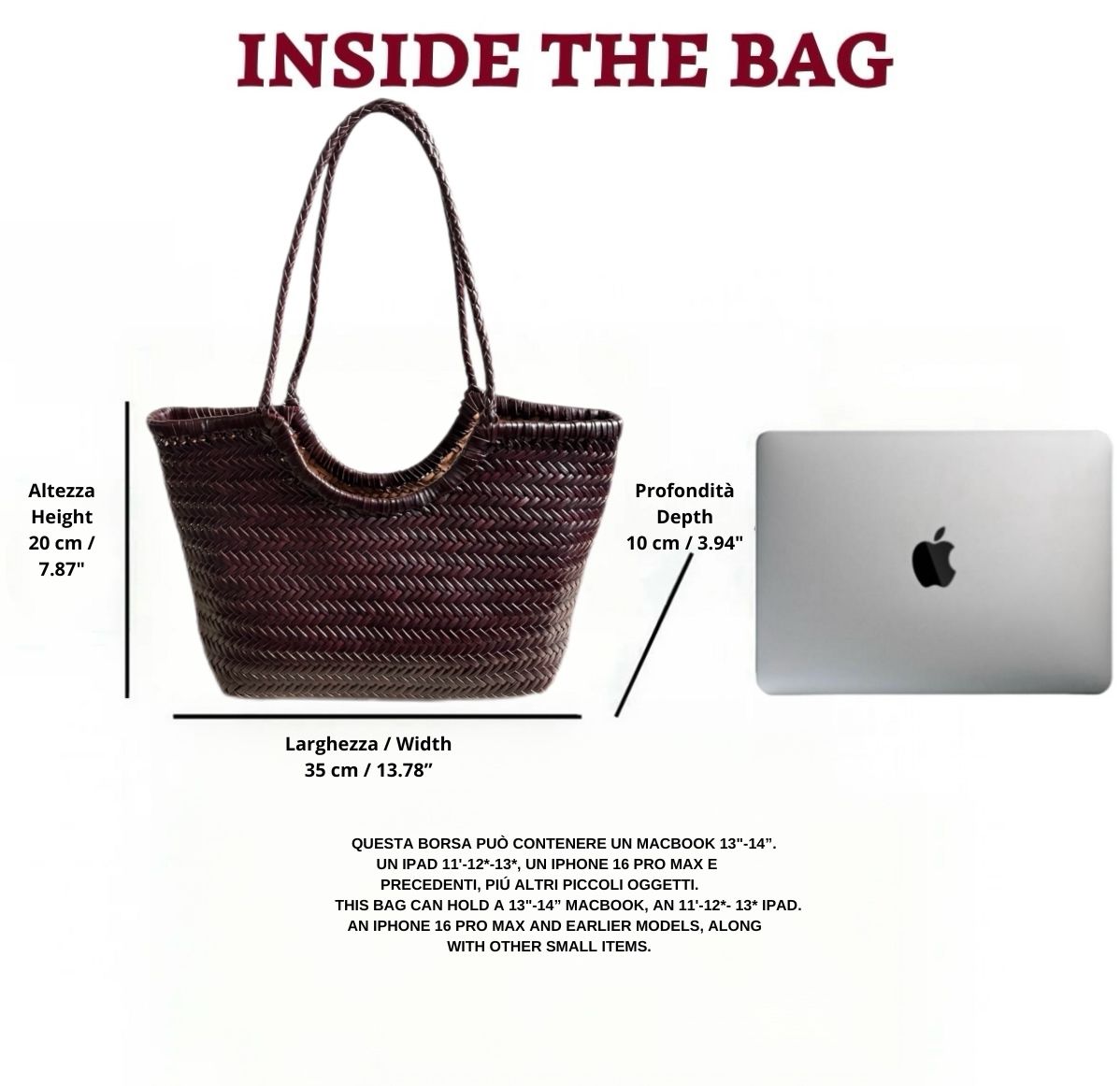 Crafted from genuine woven leather, this bag combines artisanal elegance with a modern silhouette.