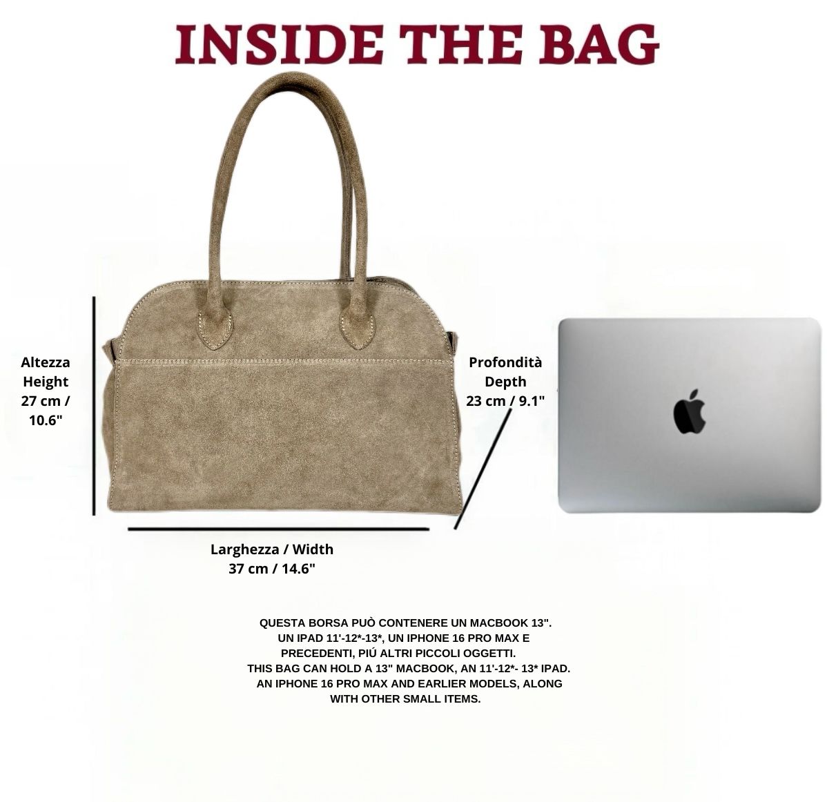 Elegance and practicality meet in the Missé 37 cm bag, made from high-quality suede leather and enhanced with gusset details. The internal zip ensures maximum convenience and security, while the shoulder strap with side hooks adds a touch of style and functionality.
