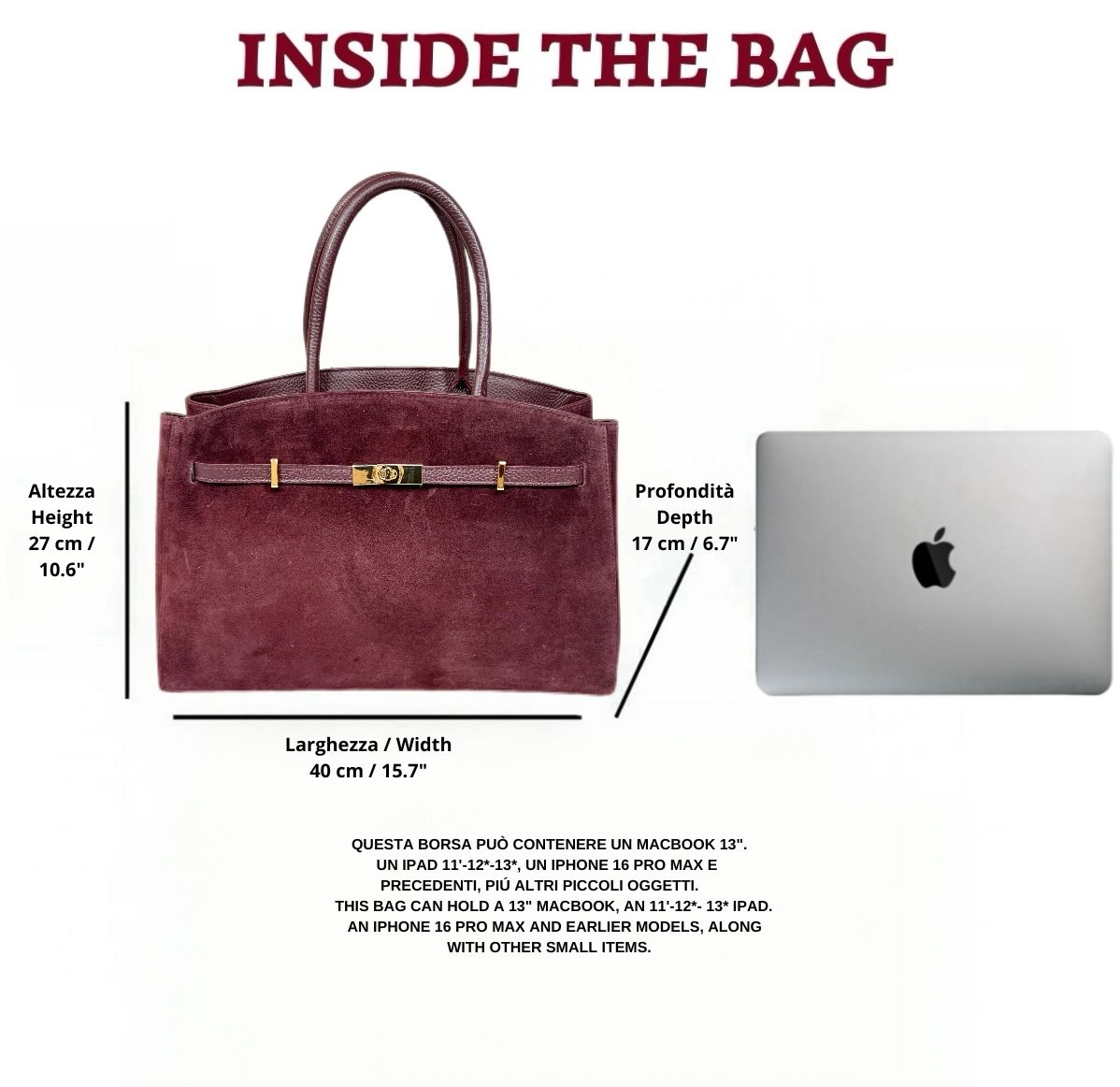 The Velvet bag is an elegant and functional tote, crafted from a refined combination of materials: soft suede on the front panel and expandable sides with snap buttons to adjust capacity, and grained leather on the handles, base, and top trim for durability and a premium look.