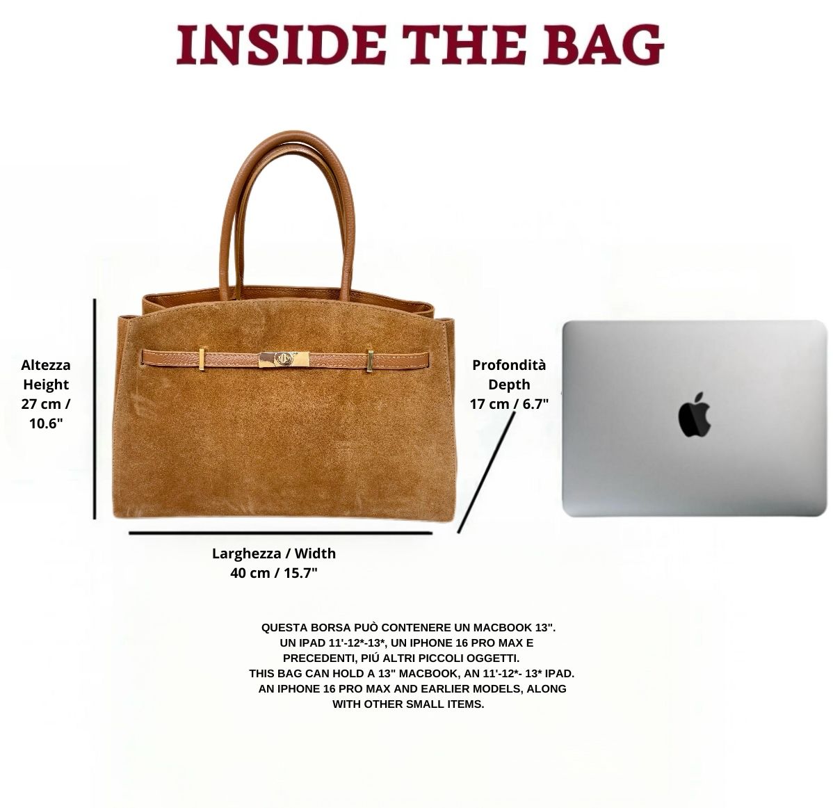 The Velvet bag is a tote that combines elegance and functionality. Crafted from a refined mix of soft suede on the front panel and expandable sides with snap buttons to adjust capacity, and grained leather on the handles, base, and top trim for durability and structure.